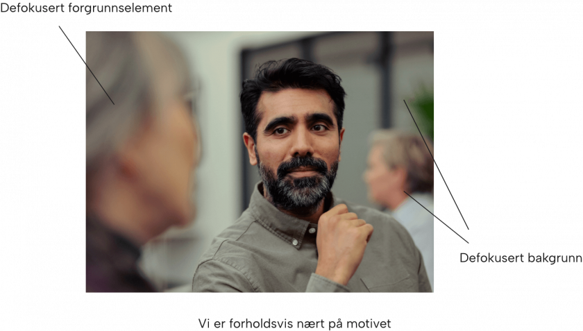 Nærhet til mennesker skal være et signaturelement i alle våre bilder, og god dybde – i form av lav dybdeskarphet – vil dermed være et bærende virkemiddel. Bildene våre bør ha minst tre plan, hvor forgrunn og bakgrunn er uskarpe, med et tydelig definert fokuspunkt stigende frem i rommet i mellom.